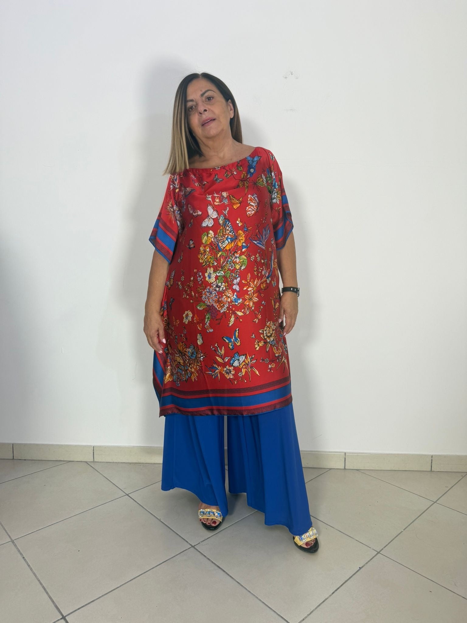 • Il Caftano rosso è un capo elegante realizzato in seta e viscosa. Questo materiale offre una combinazione di morbidezza e lusso. La cornice blu aggiunge un tocco di contrasto e raffinatezza al design. Perfetto per occasioni speciali, questo abito unisce stile e comfort.