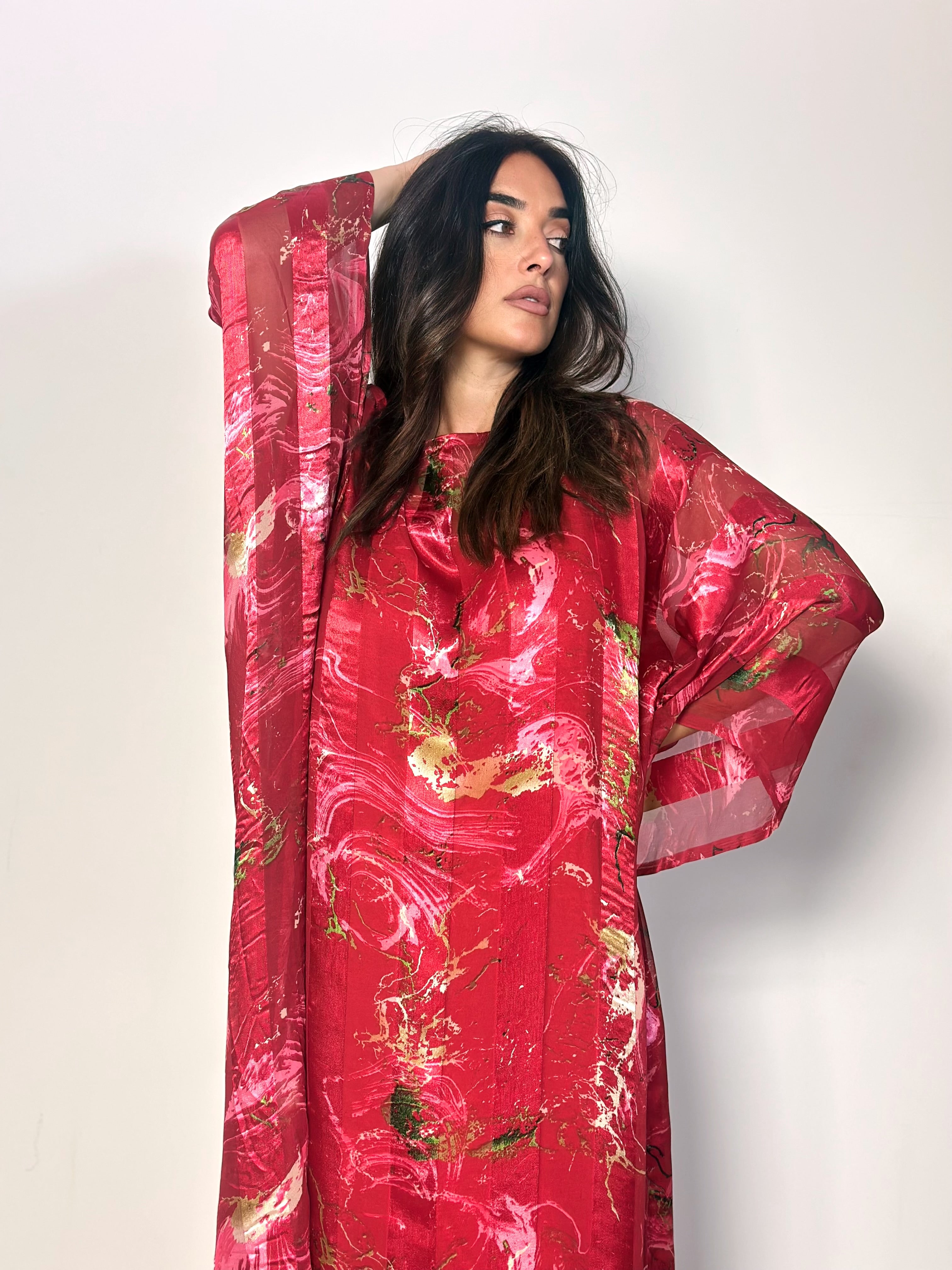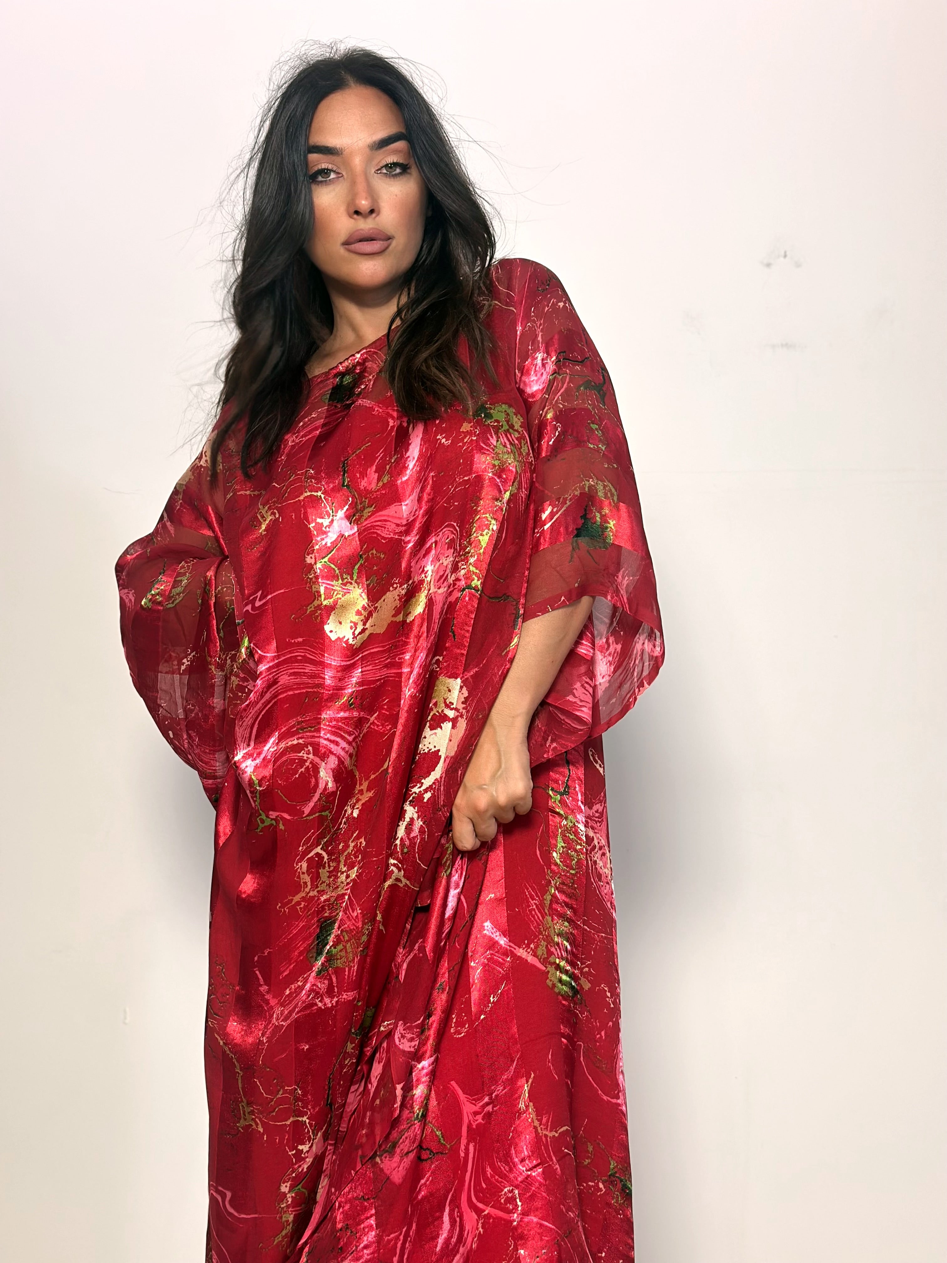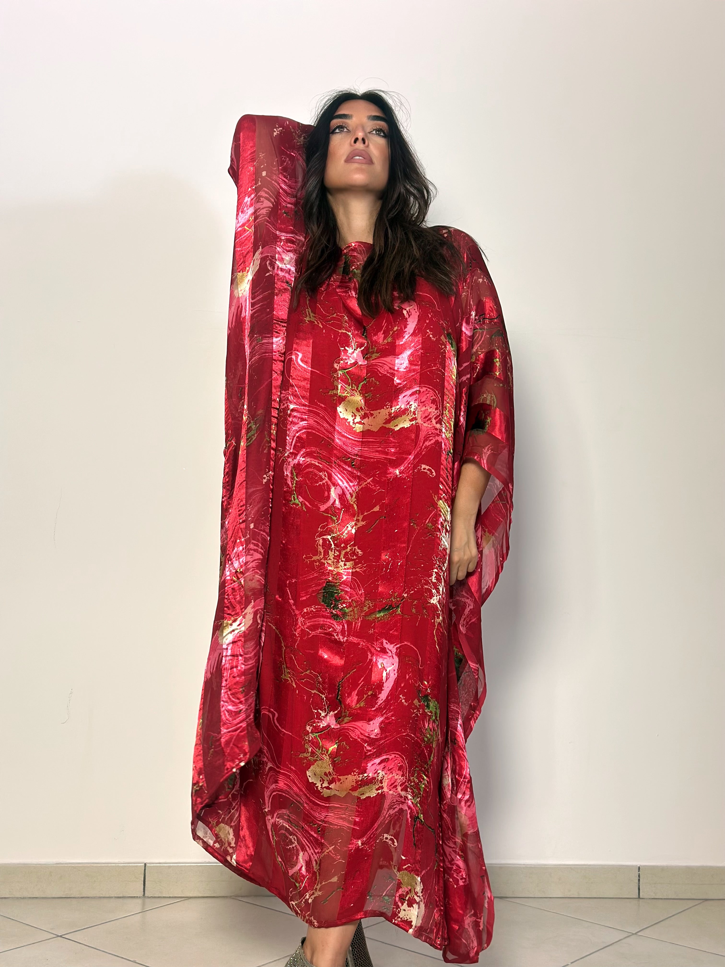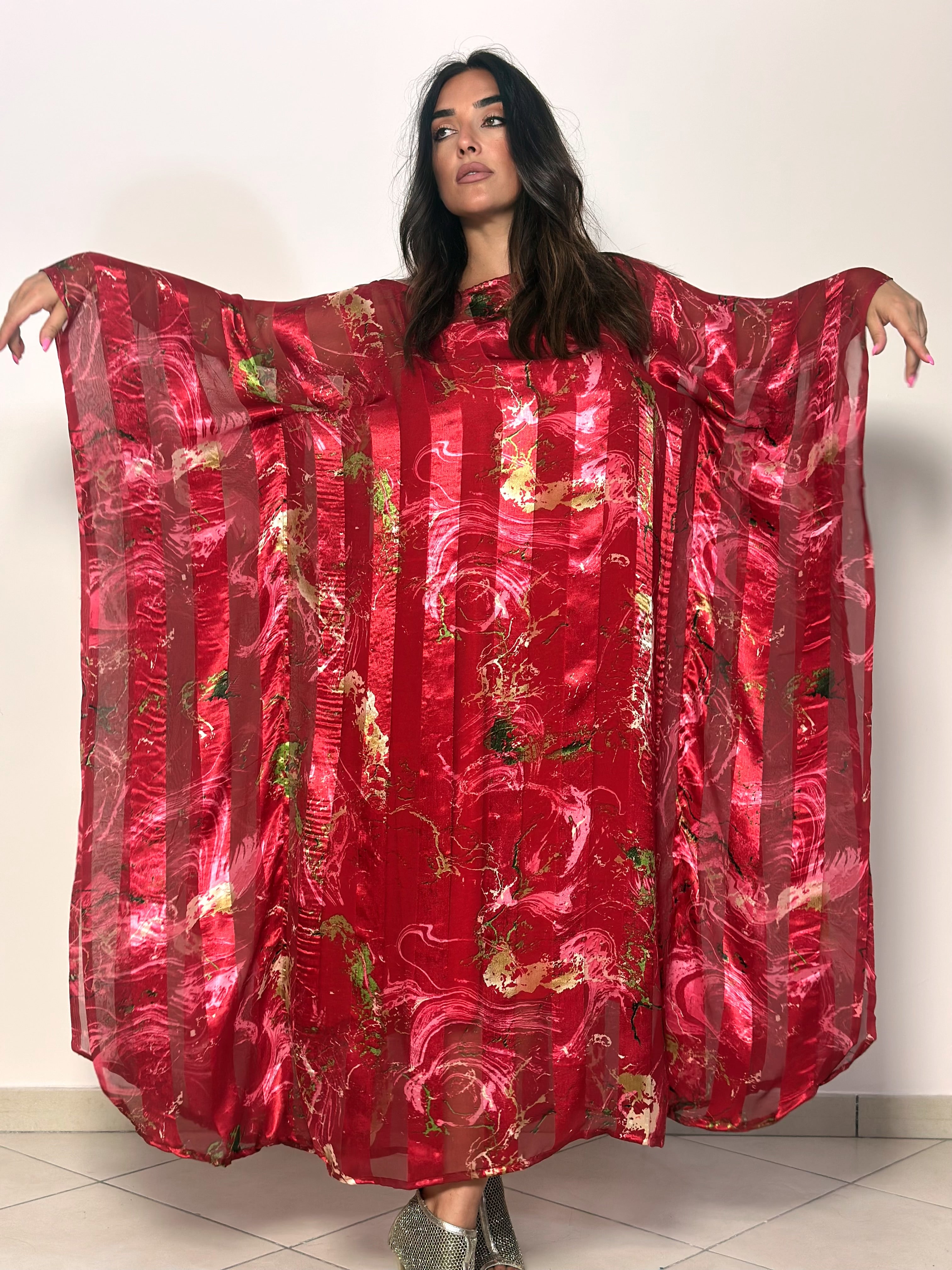 Il Caftano rosso e oro è un capo unico. Presenta una tonalità di rosso con venature oro che lo rendono distintivo. La sottoveste è di colore rosso, complementando il principale abito. Questo abito è un mix di stile e tradizione.