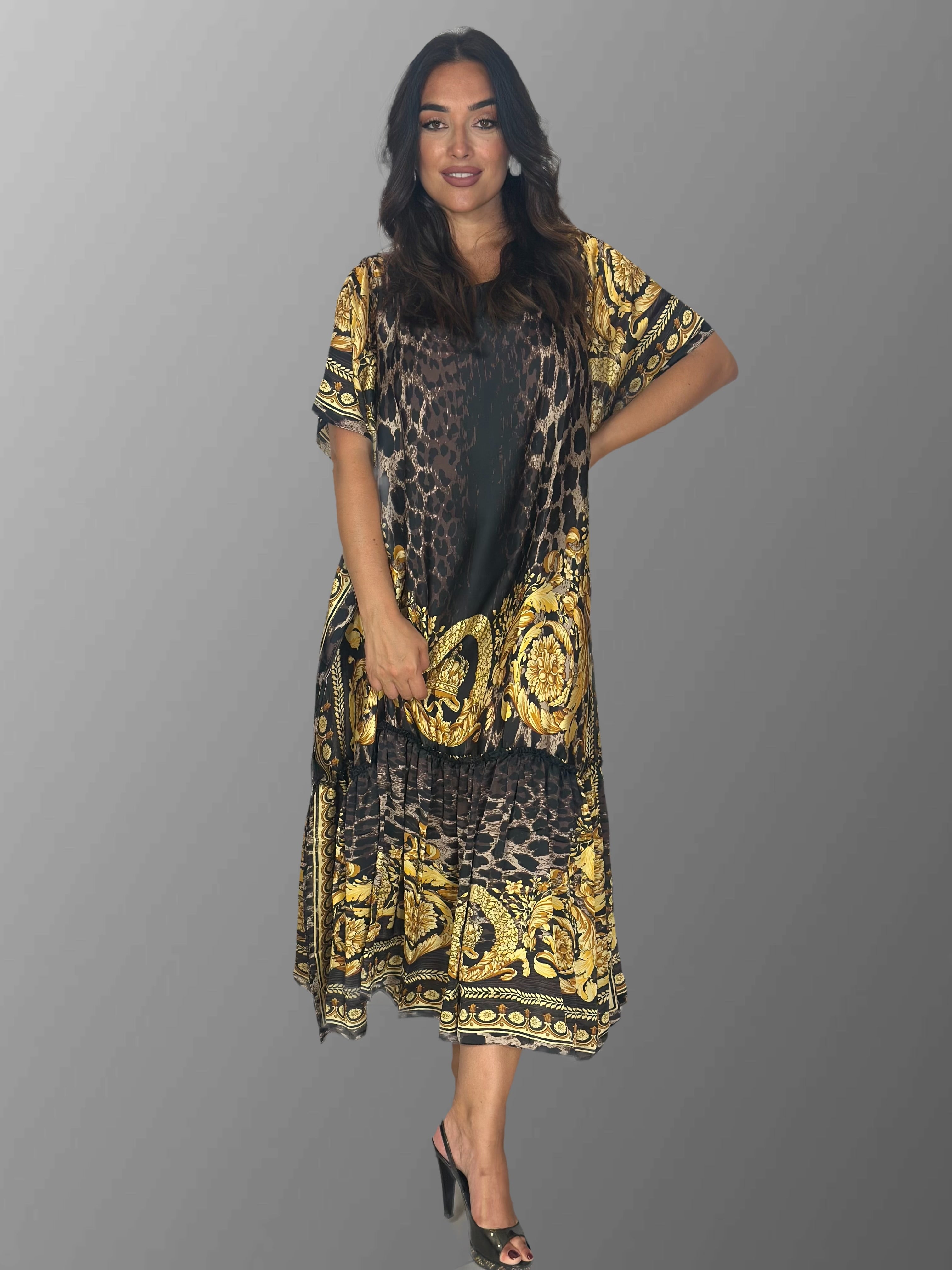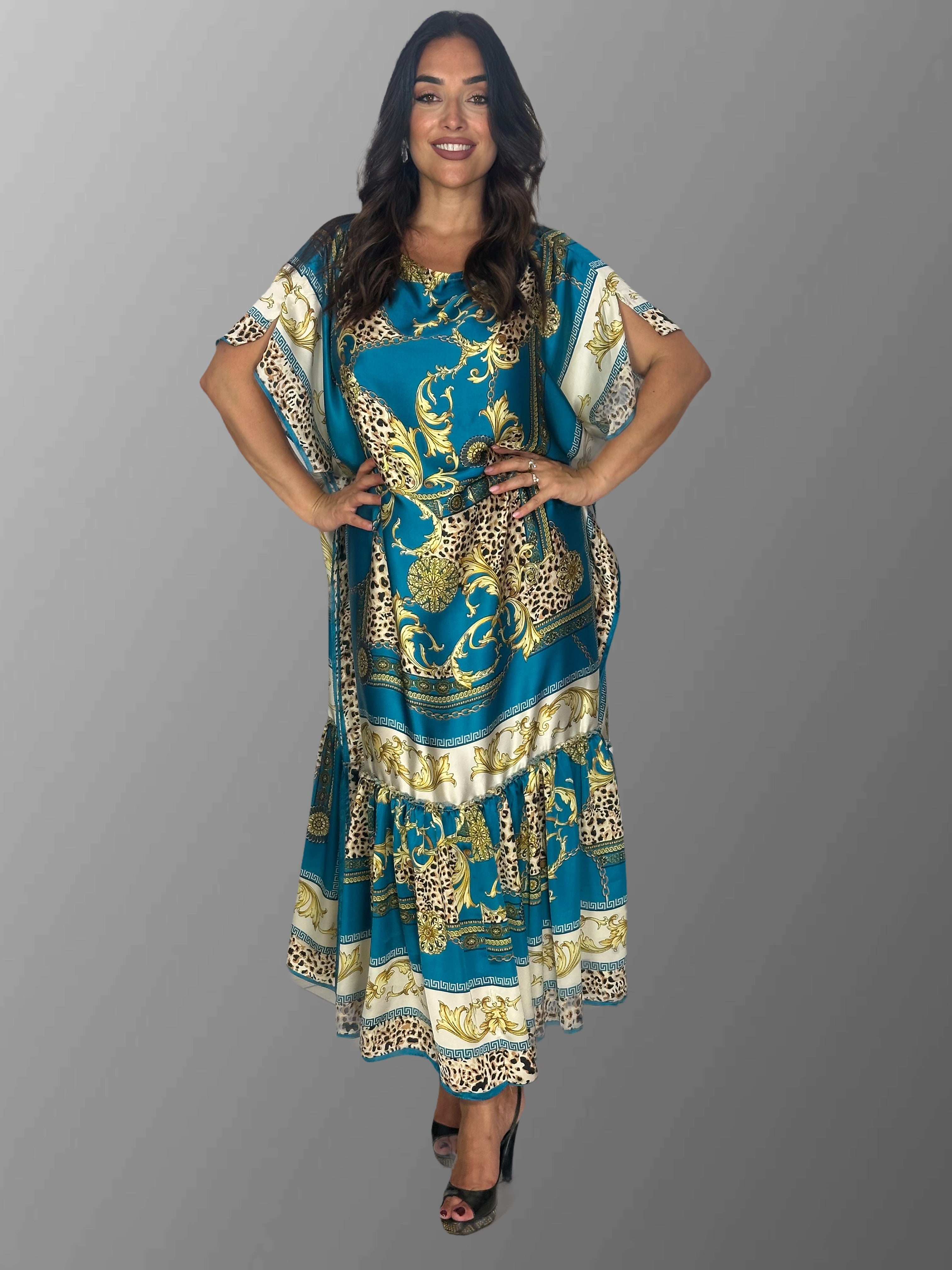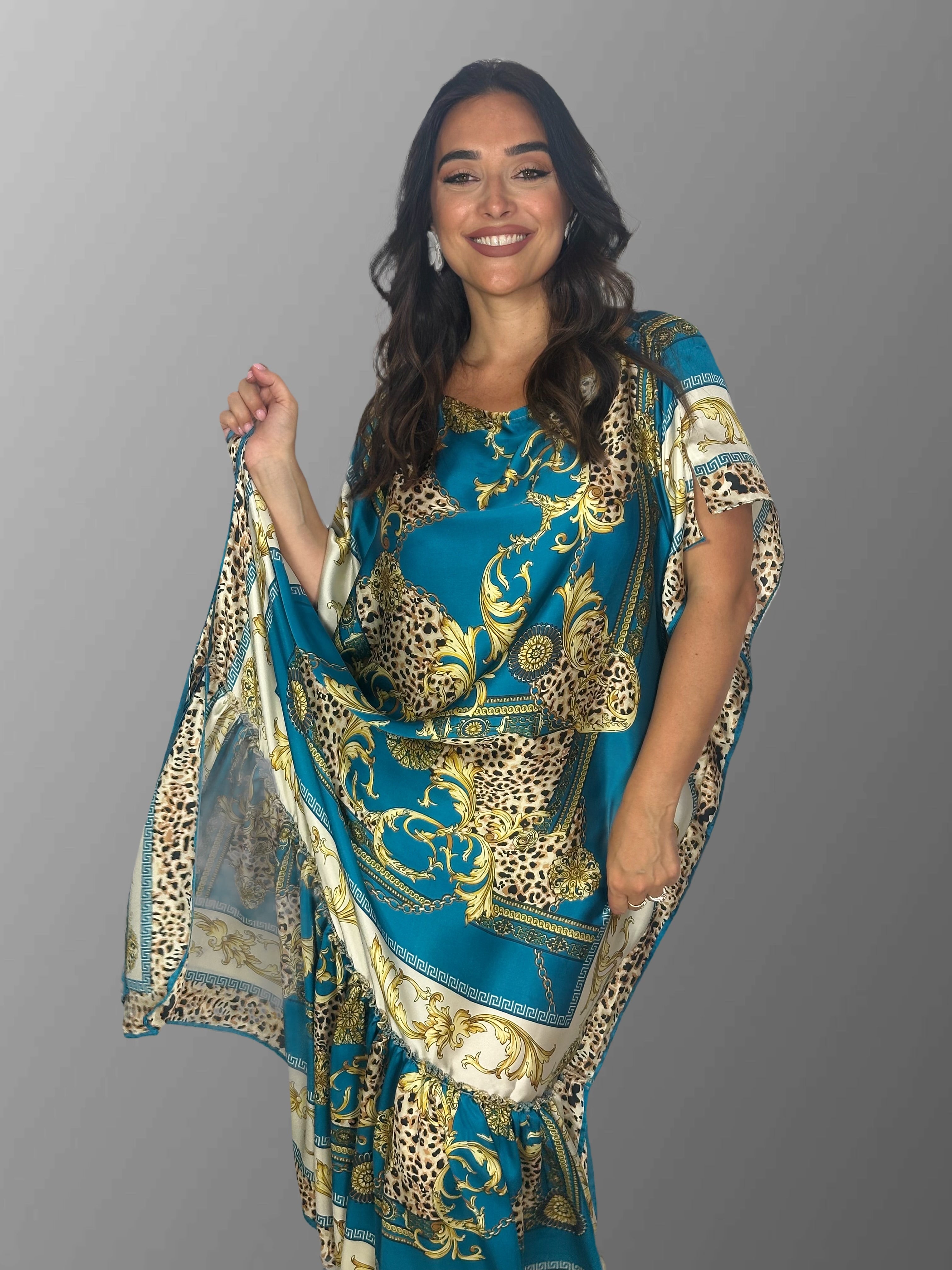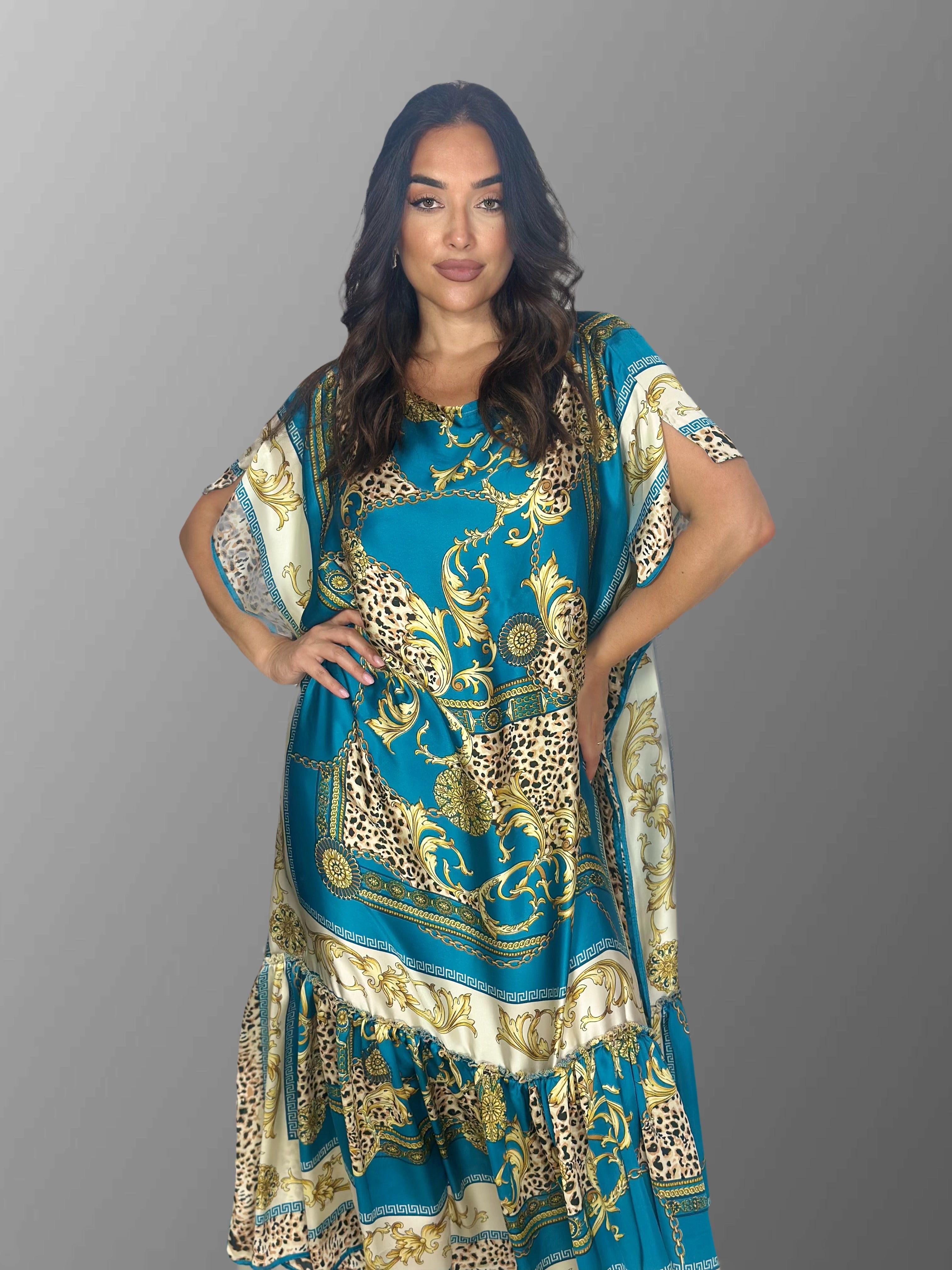 Abito olè è presente in 2 versioni, una nero e oro e l 'altra in turchese e panna