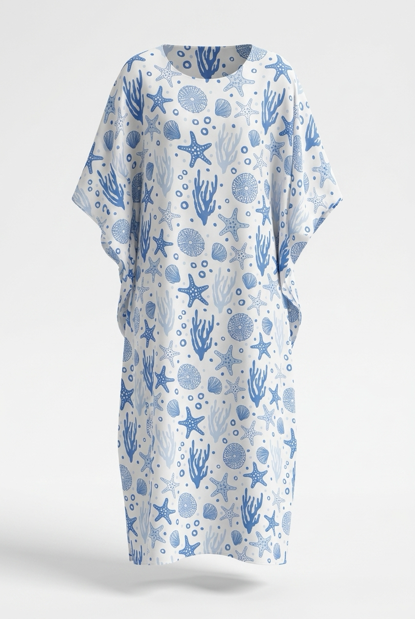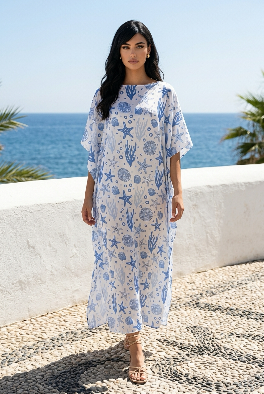Immaginati sulla riva, avvolta in questo tessuto morbido e fluente, con i colori del mare che danzano intorno a te. Dal beach club alla cena al tramonto, il Caftano Marino si adatta con grazia a ogni occasione.