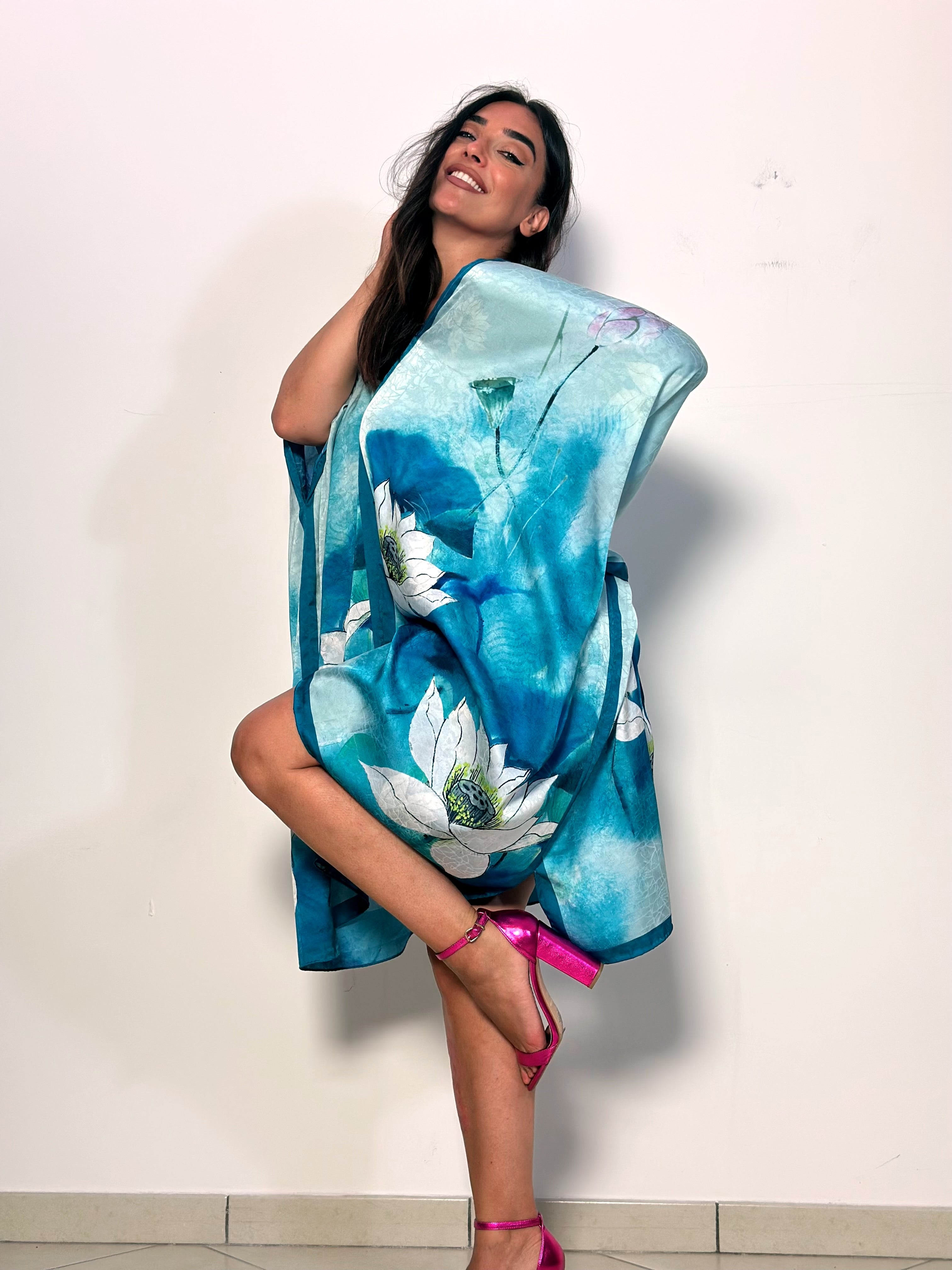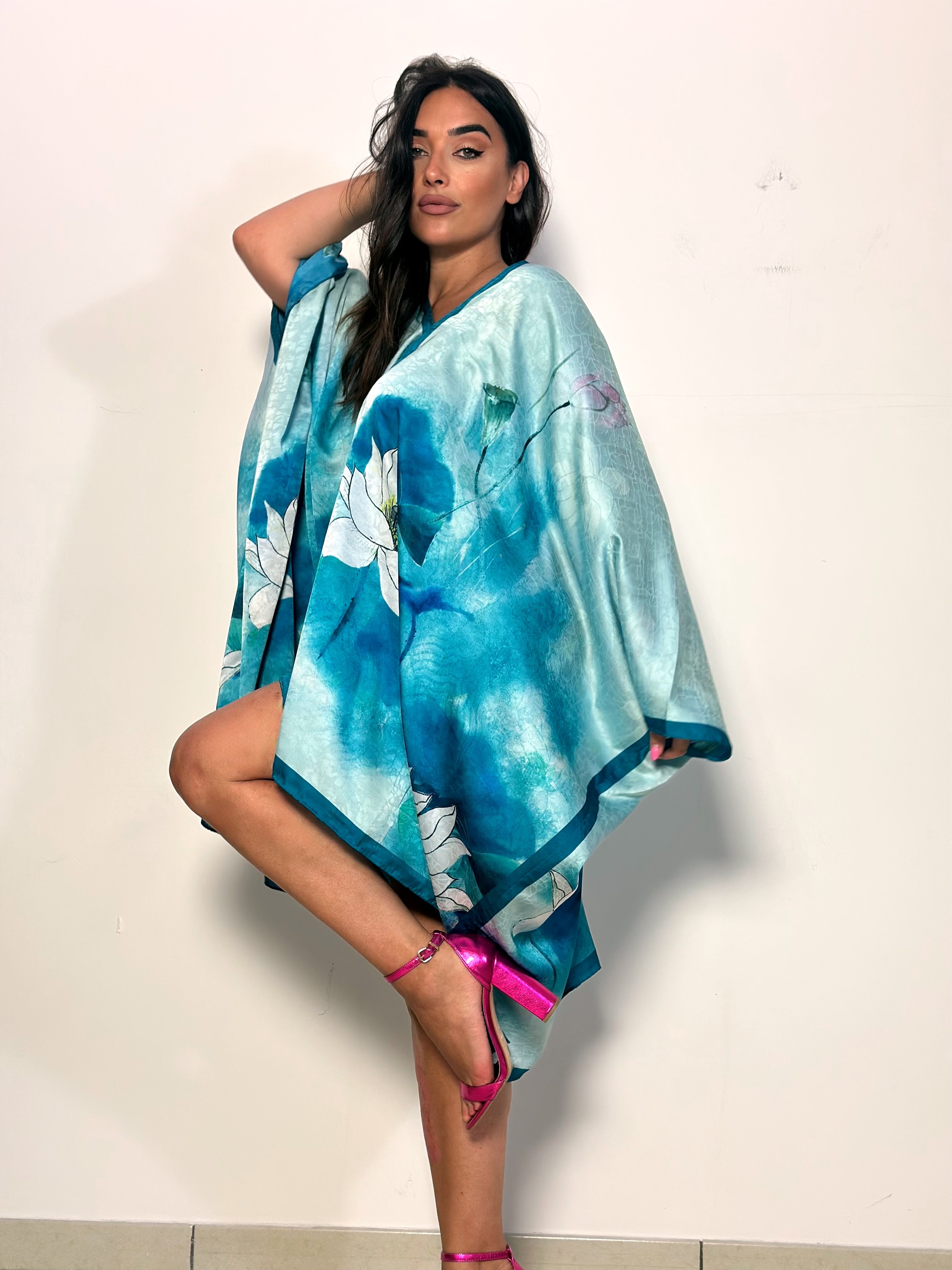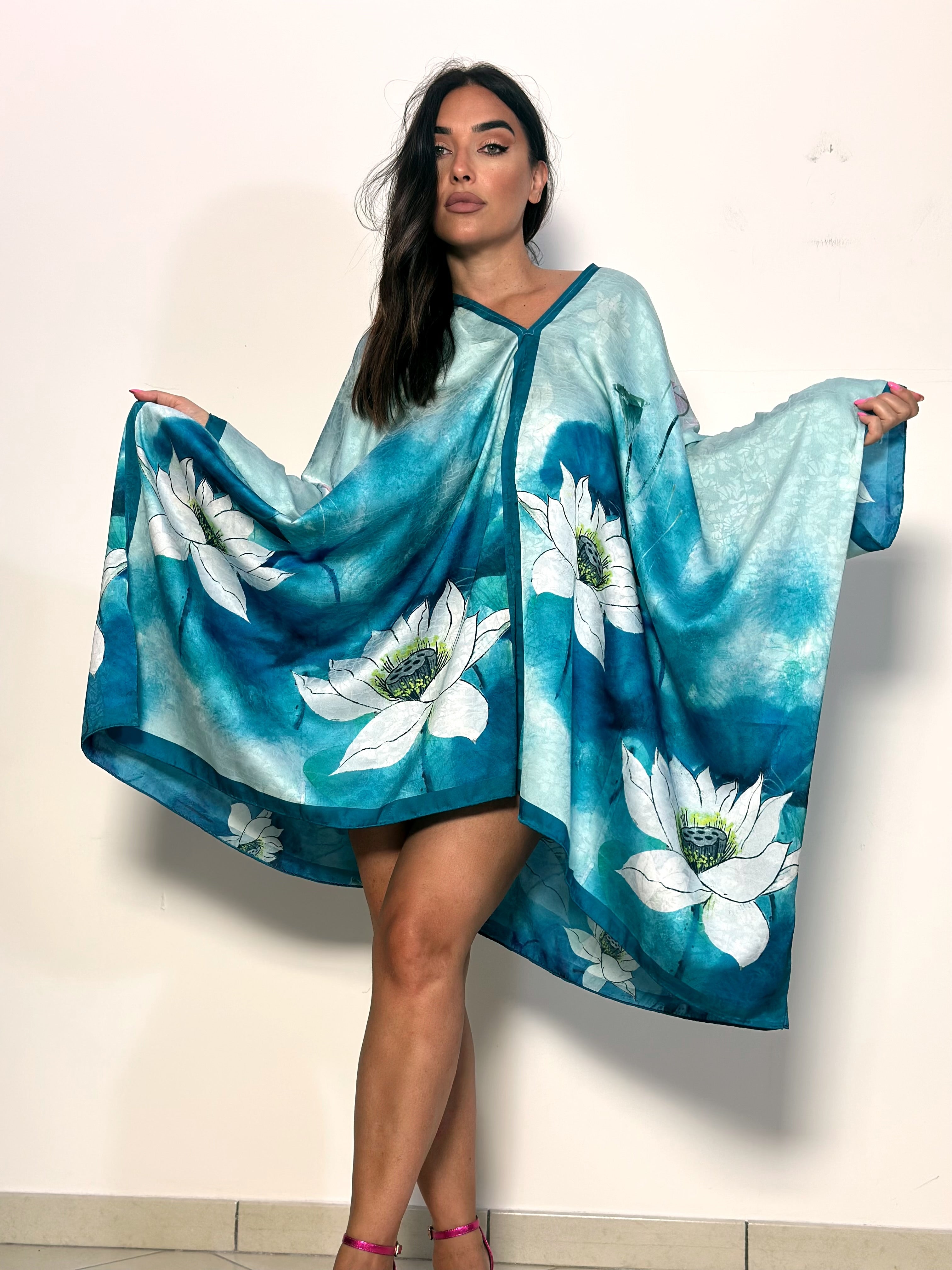 • Il Caftano Ninfee è un capo elegante con un design a V. La sua tonalità azzurra lo rende unico e versatile. Perfetto per occasioni speciali o per un look casual chic.