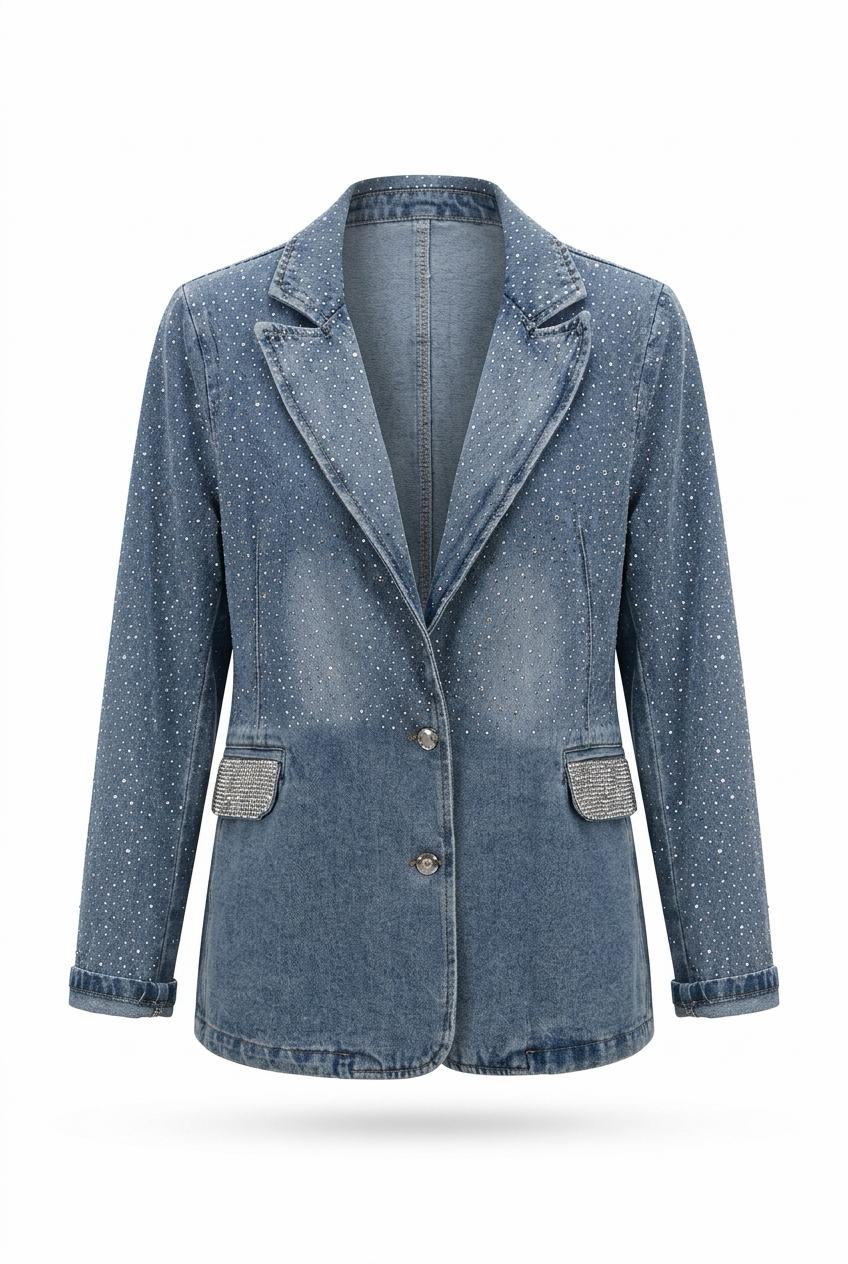 La Giacca con Strass è il capo che trasforma ogni look in uno spettacolo di luce. Impreziosita da strass scintillanti applicati con cura artigianale, questa giacca cattura ogni riflesso e lo restituisce moltiplicato, rendendoti protagonista assoluta di ogni occasione.