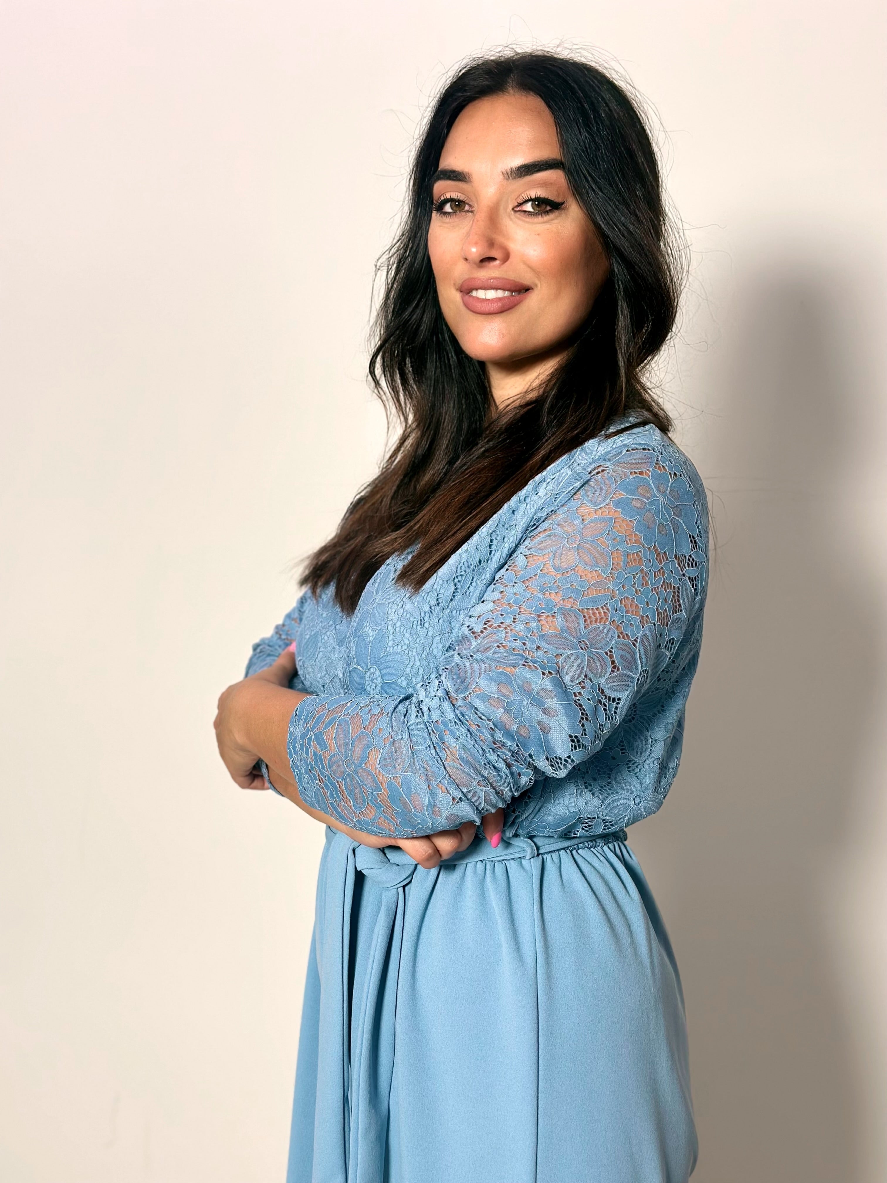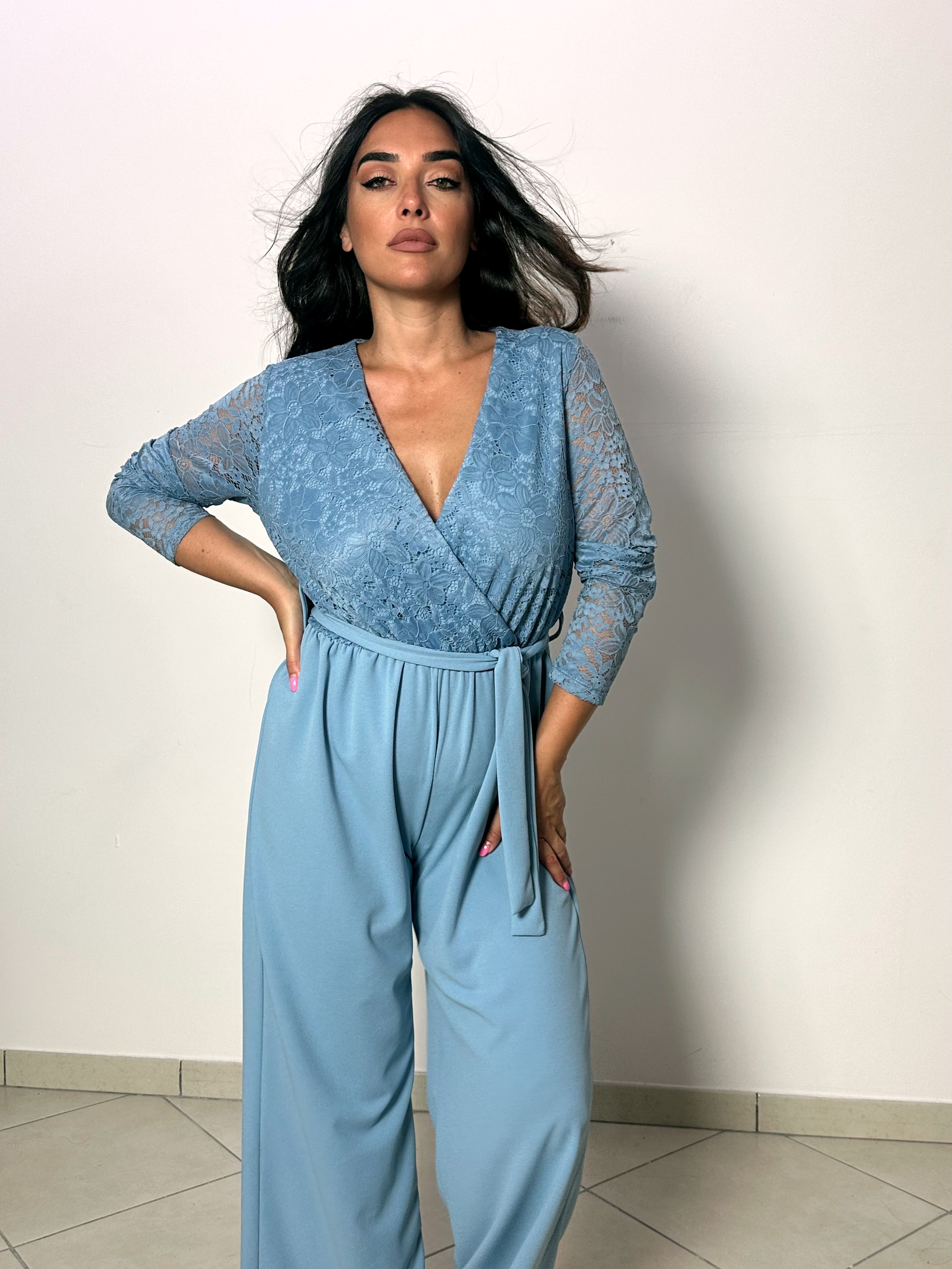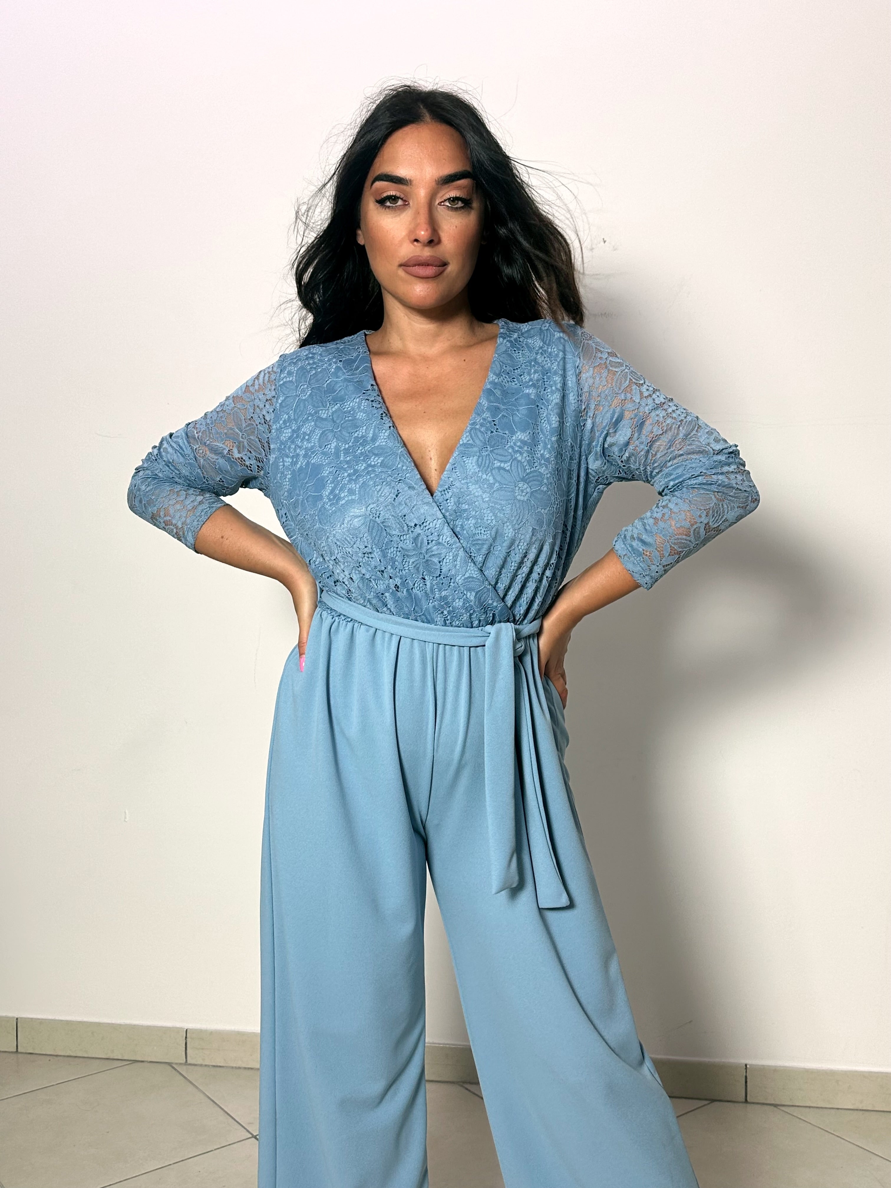 La Tuta Turchese presenta un design sofisticato con un scollo a V in pizzo turchese. Questo dettaglio conferisce alla tuta un aspetto raffinato e femminile. La cintura è integrata perfettamente, evidenziando la linea del corpo. Un capo essenziale per chi ama lo stile.